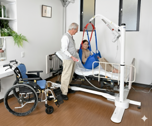 ベッドの重さを利用して設置するリフト。支柱の置き方とアームの可動に選択肢があるため、居室から屋外に出たり、スリングによってはベッド周りで動けるリフトです。