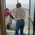 ベッドの上でスリングシートを装着し、掃き出し窓脇に置いた車いすに直接着座が可能。素敵な笑顔でパチリ📸 おおよそ2分弱で完了!